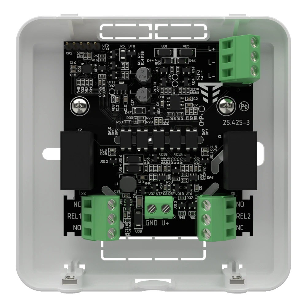 AM-OUT2R – адресний модуль, призначений для управління протипожежними засобами в системі Tiras PRIME A. Підключається до адресного інтерфейсу та додає 2 потужні реле, які здатні комутувати напругу як постійного, так і змінного струму. Оснащений ізолятором короткого замикання. 2 потужні релейні виходи; Вбудований ізолятор короткого замикання; Світлодіодна індикація режимів роботи та стану пристрою; Живлення від зовнішнього джерела.