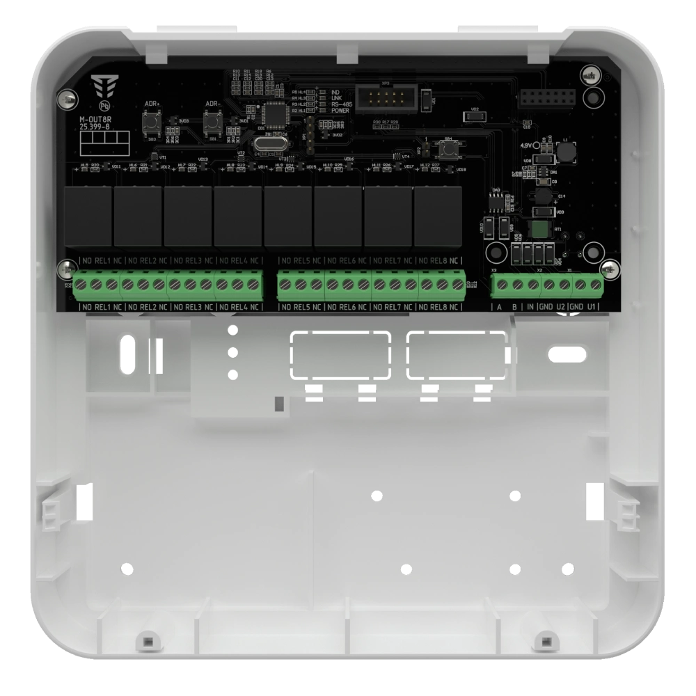 Модуль «M-OUT8R» призначений для розширення системи пожежної сигналізації на базі ППКП серії «Tiras PRIME» та ППК серії «Оріон NOVA» на вісім релейних виходів. 8 релейних програмованих виходів із перекидним контактом; Підтримка роботи із системами на базі: ППКП серії «Тірас-П»; ППКП серії "Tiras PRIME"; ППК серії "Оріон NOVA" та ППК "Orion NOVA L"; СПСА "Тірас-А" (з адресним модулем АМ-4); Універсальне виконання для роботи з ППК та ППКП 12V, 24V; Ліфтові клемні колодки; Підключення модуля системної шини RS-485; Ергономічний пластиковий корпус.