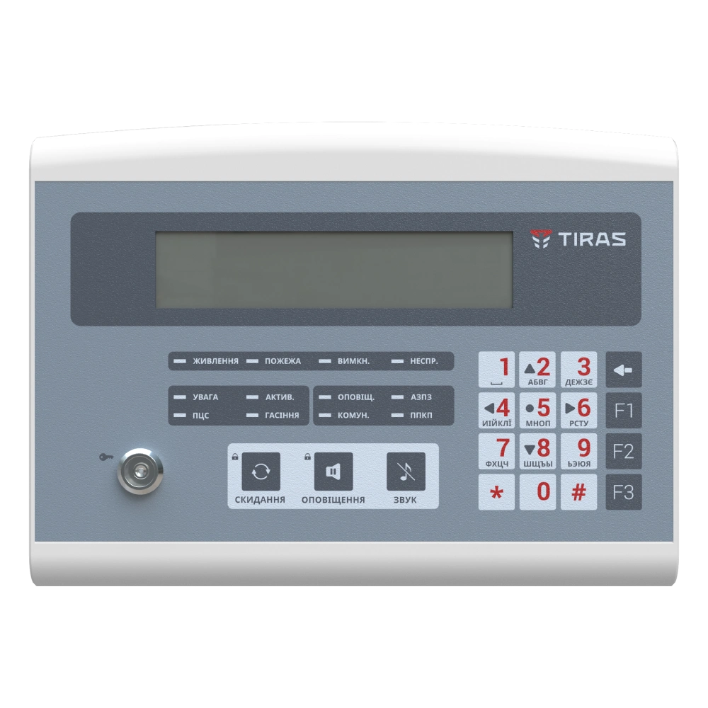 ПКІ "Тірас" призначена для віддаленого контролю та індикації стану ППКП за допомогою світлових індикаторів та дисплею. Великий LCD-дисплей ємністю 160 символів; Робота з ППКП серії "Тірас-П"(за винятком ППКП «Тірас-16.128П»), "Тірас-П.1", ПУіЗ "Тірас-1", M-OU8R; Можливість керування ППКП та пристроями системи: скидання тривог, вимкнення оповіщення та зон; Підключення до приладів за допомогою інтерфейсу RS-485; Ведення журналу на 255 події; Повноцінне виконання вимог ДБН-В2.5-56-2010 в частині обладнання пожежного посту.