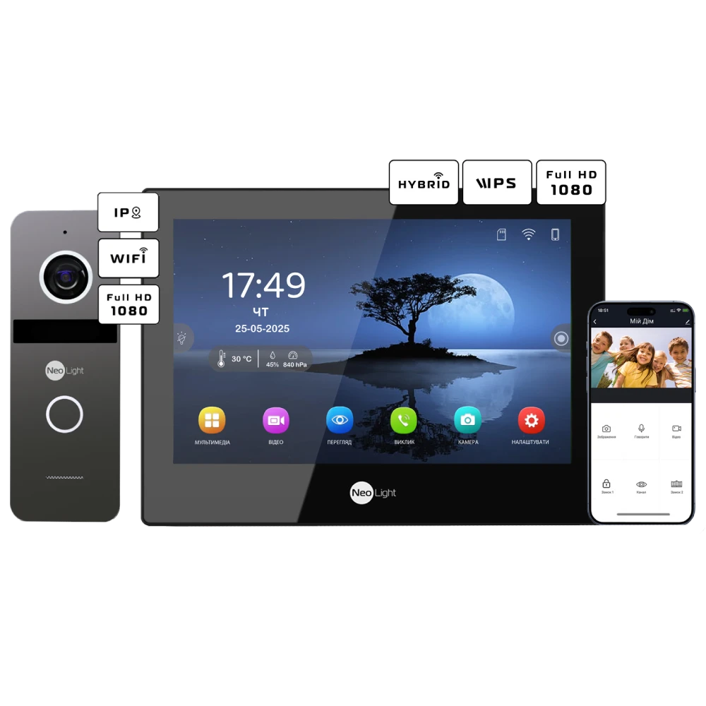 Комплект відеодомофону Neolight ALPHA Hybrid Black + SOLO IPW Graphite с уголком, PoE адаптер для вызовной панели