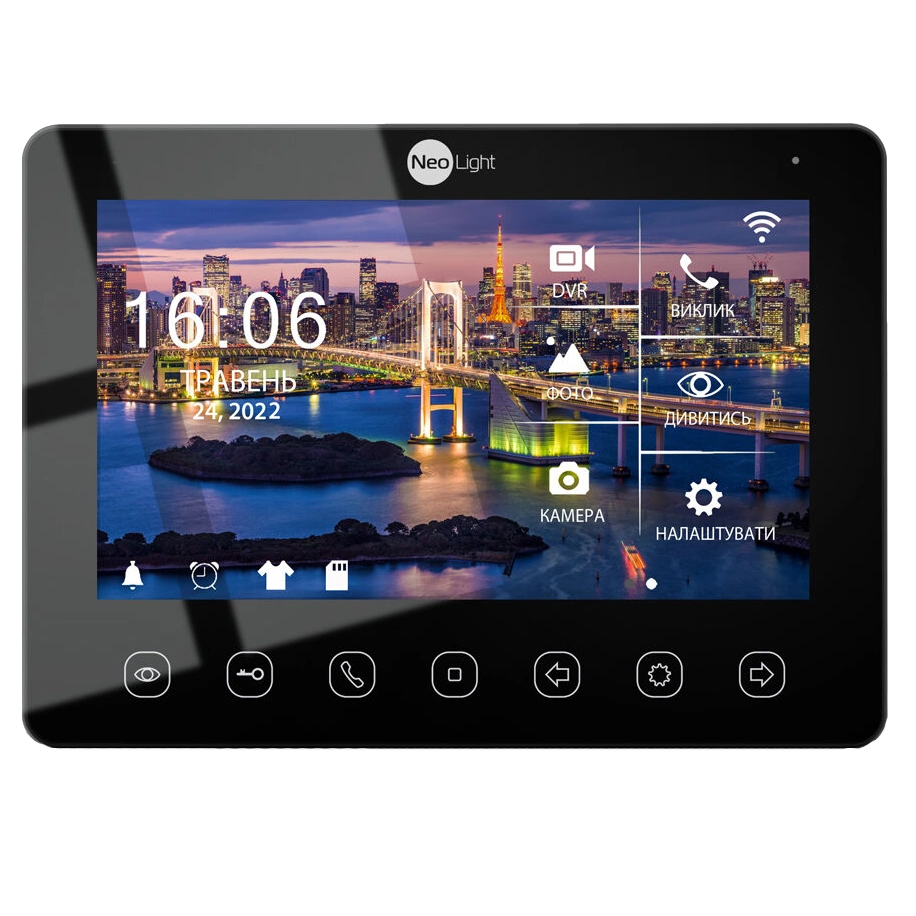 Розмір екрану 7", IPS; Роздільна здатність екрана 1024 х 600; Формат вхідного сигналу AHD / TVI / CVI / CVBS; Роздільна здатність вхідного сигналу 1080p / 720p / 576i; Мережа Wi-Fi (2,4 ГГц), LAN; Мобільний додаток (AP ) NeoLight (iOS, Android) Варіанти підключень: 2 визовні панелі + 2 відеокамери + 3 додаткових відеодомофона, 1 визовна панель + 3 відеокамери + 3 додаткових відеодомофона; Вбудована пам'ять; Роз'єм для microSD до 128 ГБ; модулем NL-GT01, Живлення 220В AC, 186 х 136 х 21 мм