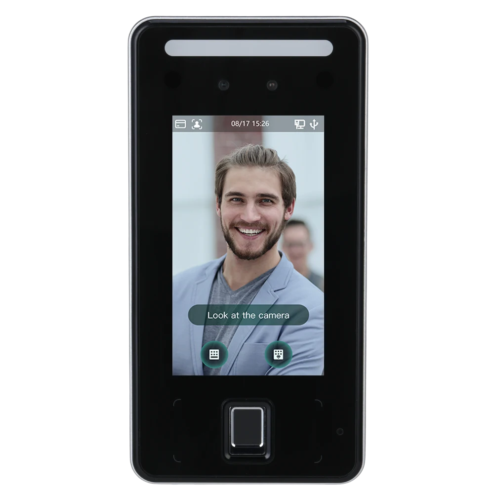 4.3 "LCD сенсорний екран 480х272; 2МП двохлінзова камера з ІЧ; пам'ять: 6000 облич, 6000 карт, 6000 відбитків, 150 000 подій; сумісність CGI; 1 USB2.0, RS485, 1 Wiegand, 1 Ethernet 10/100 Мбіт / с, 1 тривожний вхід, DC 12В 2A, 24 Вт, –30 ° C – 60 ° C