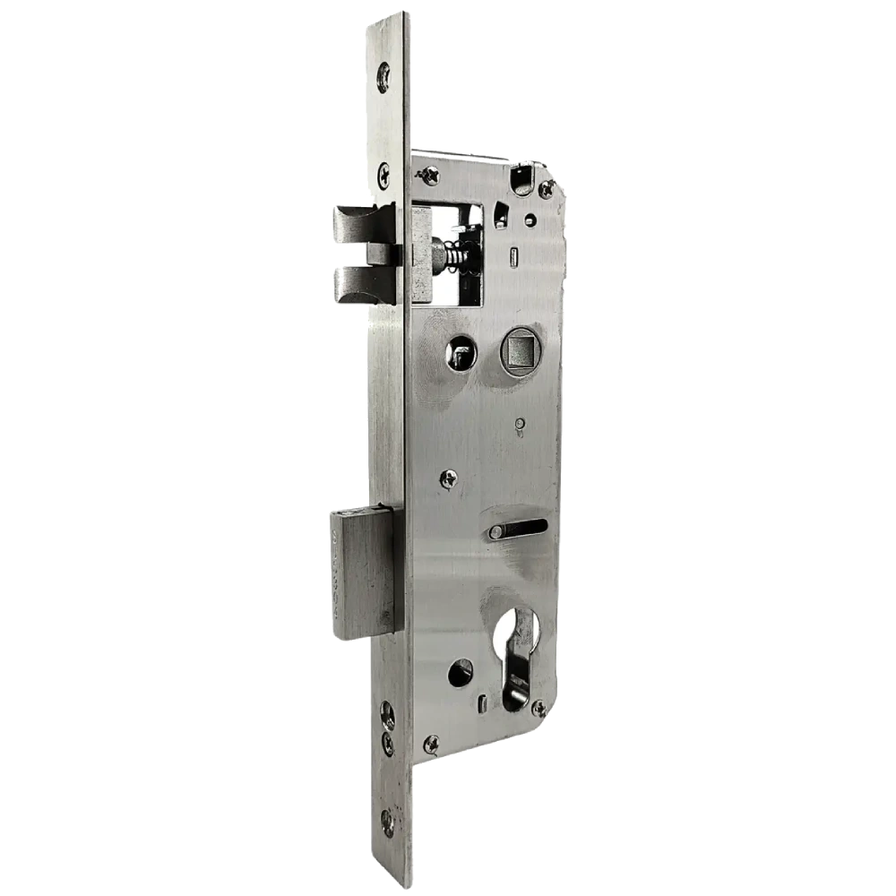 Врізний замок для дверей із посадковим розміром 40х85 мм. Автоматичне замикання — на косий ригель. Також може бути примусове замикання на прямий ригель — рухом “ручка вгору”.
