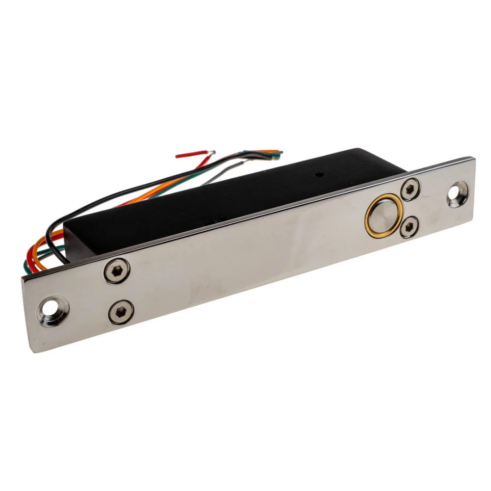 компактний; Врізний електрорігельний замок; Ригель з нержавіючої сталі; Латунна вставка; Роликовий механізм підняття ригеля (зменшує механічне зношування); Таймер затримки 0, 3, 6 секунд; Нормально відкритий (NO); Розміри врізної частини (без планки) 117,5 * 23,5 * 35 мм, ригель замку діаметр 12 мм, довжина 15 мм; Живлення: DC 12В, 1200 мА (робоче) | 200 мА (режим очікування)