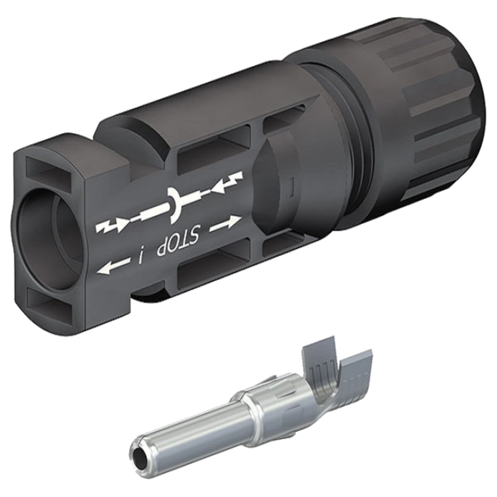 MC-4 конектор Staubli MC-plug PV-KST4/6I-UR 5-6мм (тато) призначений для з'єднання фотомодулів та інверторного обладнання до 1000 В номінальної напруги. Конектор витримує струм високого навантаження і відрізняється простотою використання з безпечним для людини з'єднанням (стиковкою). При використанні конекторів MC-4 можливе багаторазове з'єднання-роз'єднання. Надійна фіксація, висока герметичність (IP67), розвантаження від натягу та широкий діапазон температур дозволяють цьому багатоконтактному штекерному роз'єму відповідати всім вимогам до зовнішнього обладнання.