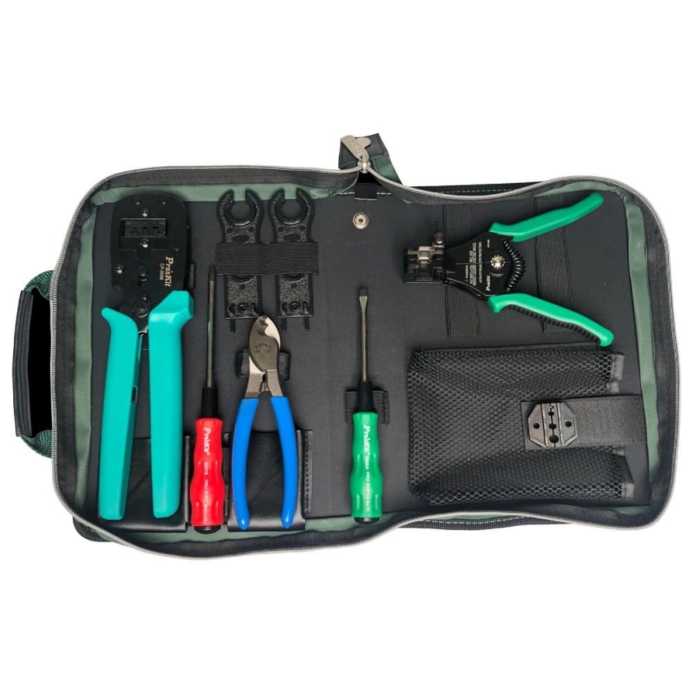 Інструменти у сумці Pro’sKit PK-2061 для Solar-конекторів. Набір містить все необхідне для якісної та безпечної установки/обслуговування сонячних електростанцій: 2 гайкові ключі (з відкритим кінцем MC4 та MC4 PLUS, розблокувальним інструментом для відкривання запірного пристрою, затискання та затягування кабельних вводів), стрипер для зачищення ізоляції сонячного кабелю з пружинним механізмом та регульованим обмежувачем, кримпер для обтискання плоских неізольованих роз’ємів (автоклем), дві змінні матриці, різак і дві викрутки з оксидним наконечником.