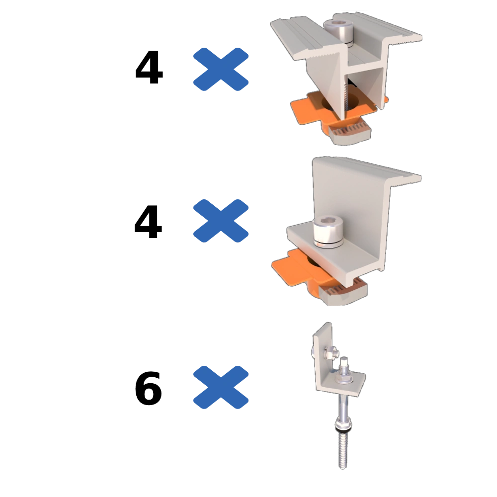 Універсальний комплект, що призначений для похилих покрівель з металочерепиці, профнастилу, шифера, чи ондуліна. Монтаж профілю здійснюється за допомогою кронштейна кріплення до металочерепиці. В покрівлі свердлиться отвір, в який вкручується шуруп-гвинт. Гайкою притискається гумовий ущільнювач, що забезпечує герметичність. Шуруп-гвинт з’єднується з монтажним профілем через кутник. Положення кутника регулюється і фіксується гайками.