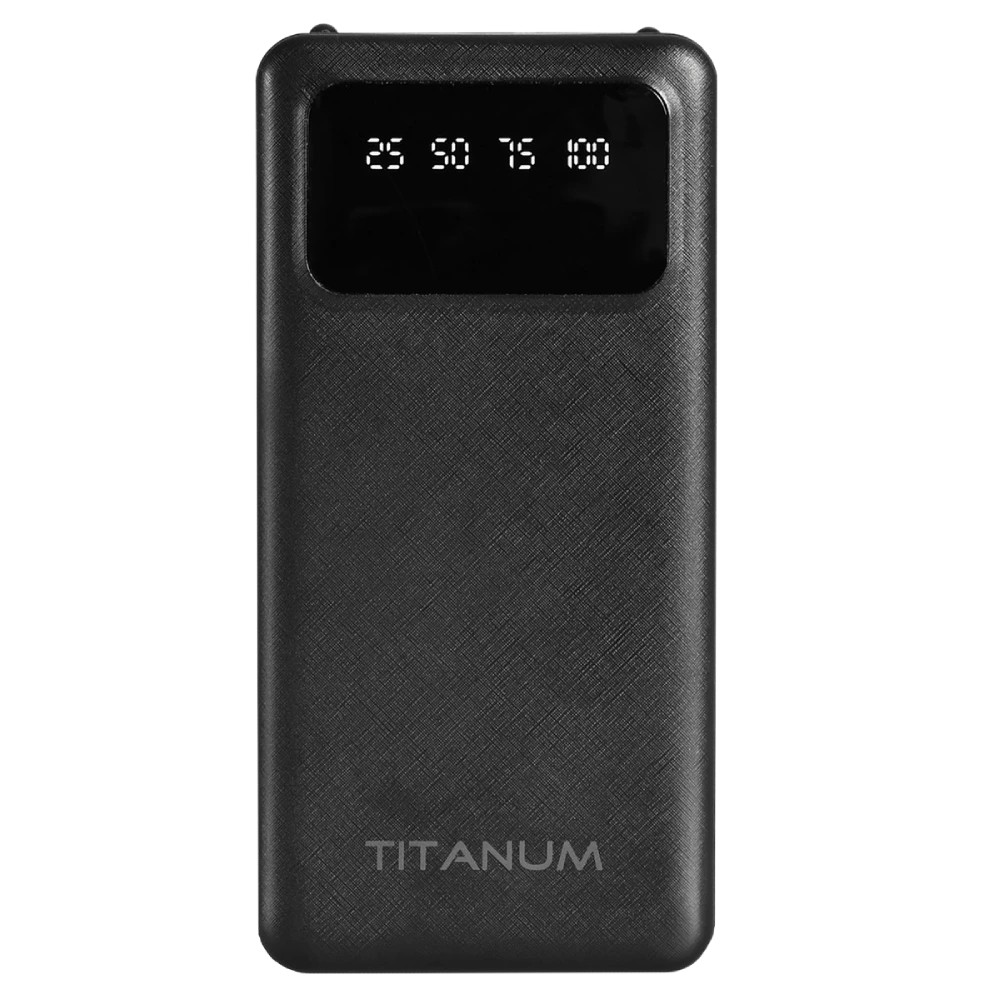 Портативний зарядний пристрій (Power Bank) TITANUM призначений для зарядки планшетів, смартфонів, мобільних телефонів та інших пристроїв та гаджетів. Він дозволяє підтримувати улюблені гаджети в робочому стані тривалий час в поході, подорожі, поїздці чи в ситуації коли немає електроенергії. Корпус виконаний з АBS пластику, який має рифлену поверхню, що в свою чергу допомагає запобігати подряпинам на корпусі та надійніше тримати в руці.КОРИСНІ ФУНКЦІЇ: Має два ліхтарики вбудованих в корпус на передній частині та дисплей, який відображає рівень заряду батареї відповідно до позначок 25, 50, 75 та 100%.Вихідна напруга: має 2 USB виходи кожен з яких видає 5В, 2.1А (max.), максимальна вихідна потужність 2.1А (max.)Вхідна напруга: 5В, 2А – для обох входів Micro USB та Type-C.В комплект входить кабель Type-C довжиною 30см для заряджання пристрою.
