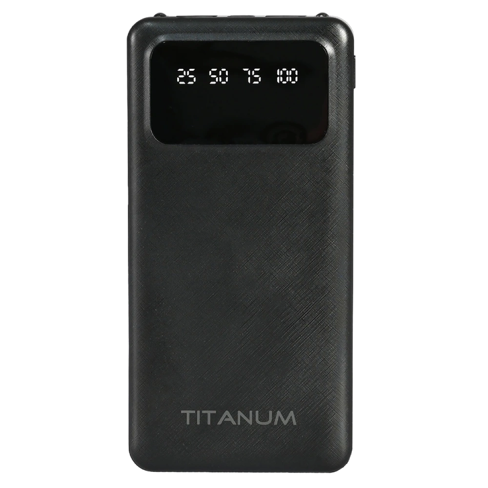 Портативний зарядний пристрій (Power Bank) TITANUM призначений для зарядки планшетів, смартфонів, мобільних телефонів та інших пристроїв та гаджетів. Він дозволяє підтримувати улюблені гаджети в робочому стані тривалий час в поході, подорожі, поїздці чи в ситуації коли немає електроенергії. Корпус виконаний з АBS пластику, який має рифлену поверхню, що в свою чергу допомагає запобігати подряпинам на корпусі та надійніше тримати в руці.КОРИСНІ ФУНКЦІЇ: Має два ліхтарики вбудованих в корпус на передній частині та дисплей, який відображає рівень заряду батареї відповідно до позначок 25, 50, 75 та 100%.Вихідна напруга: має 2 USB виходи кожен з яких видає 5В, 2.1А (max.), максимальна вихідна потужність 2.1А (max.)Вхідна напруга: 5В, 2А – для обох входів Micro USB та Type-C.В комплект входить кабель Type-C довжиною 30см для заряджання пристрою.