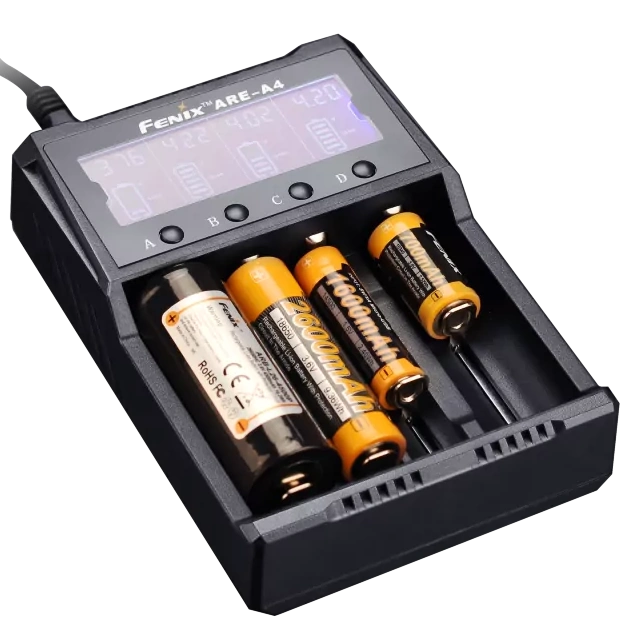 Пристрій для заряджання Fenix ARE-A4 добре працює з 9 типами акумуляторів. Його можна використовувати вдома або у подорожі, підключаючи до автомобільного акумулятора. Воно ретельно захищене від випадкових поломок, важить лише 265 г і пропонує користувачеві повний контроль за процесом заряджання будь-яких сумісних елементів живлення. Типорозміри: 18650, 16340, 21700, 26650, 10440, 14500, AA, AAA, C. Тип елемента живлення: Li-Ion, Ni-Mh, Ni-Cd