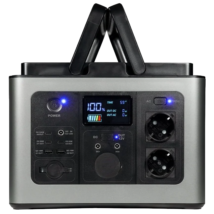 ● Потужність пристрою номінальна 700 Вт, пікова 900 Вт;● Вбудований акумулятор LiFePO4 потужністю 640 Втг (12.8В/48Аг), кількість циклів розряду-заряду АКБ ≥2000;● вхід постійної напруги: GX20 з максимальною потужністю 200 Вт із можливістю роботи від сонячних панелей, вбудований MPPT-контролер заряду (макс 24В/200Вт); вхід постійної напруги DC5521 12-24В/120Вт;● вихід змінного струму (AC): 2 порти 230 В потужністю 700 Вт, чиста синусоїда;● вихід постійного струму (DC): 2 порти 12В/10А кожен;● вихід автомобільної зарядки: 1 порт 12В/10А;● порти USB-A: 2 порти 18 Вт, з підтримкою швидкого заряджання QC3.0: 5В/3А, 9В/2А, 12В/1.5А;● порти USB-C: PD вхід/вихід: 5В/3А, 9В/3А, 12В/3А, 15В/3А, 20В/5А (100 Вт макс); PD вихід: 2 шт. потужністю 20 Вт кожен.