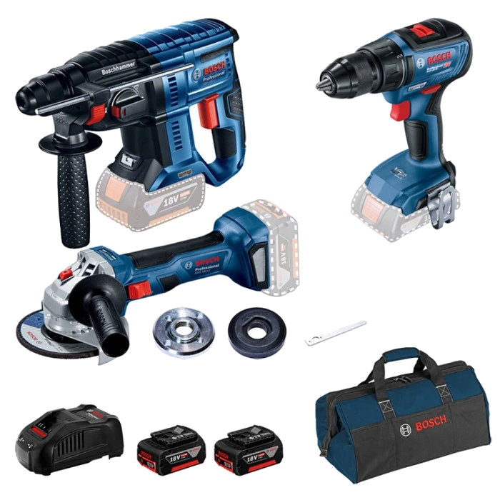 ● Акумуляторний перфоратор Bosch GBH 180-Li – потужний інструмент із високою силою удару 2 Дж та продуктивністю до 5100 уд/хв. Інструмент вагою 2.3 кг свердлить і пробиває отвори в бетоні, цеглині, камені діаметром 4-20 мм, в деревині -30 мм, металі – 13 мм. Патрон SDS-Plus Vario-Lock.● Акумуляторний дриль-шуруповерт Bosch GSR 18V-50 Professional — двошвидкісний інструмент (0-460 і 0-1800 об/хв) з моментом, що крутить, 50 Нм при жорсткому і 28 Нм при м’якому закручуванні, регульованому 20 ступенями. Швидкозатискний патрон 1,5-13 мм. Свердлить у деревині отвори діаметром 35 мм, у металі — 13 мм, а також у кераміці та пластмасі, закручує та відкручує шурупи максимальним діаметром 10 мм.● Bosch GWS 180-LI – болгарка з безщітковим двигуном для роботи з 125 мм колами. Стабільне число оборотів 11000 об/хв. Шпиндель М14. Сумісна з усіма Li-Ion акумуляторами 18 В Bosch Professional. Знімний захисний фільтр двигуна. Встановлює захисний кожух без додаткових інструментів. Плавний пуск, захист від навантаження та випадкового пуску.● Пристрій Bosch GAL 1880 CV зі струмом 8 А для заряджання літій-іонних акумуляторів напругою 14,4 та 18 В.