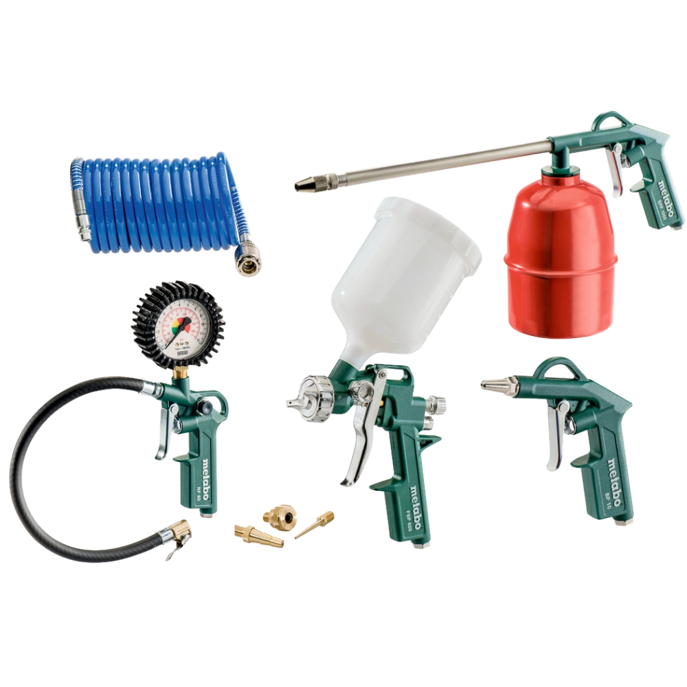 Комплект складається з продувного пістолета, шинного манометра, включаючи перехідник та порожнисту голку для м'ячів, пістолета для розпилювання фарби зі стаканом, розпилювального пістолета та спірального шланга з поліаміду. Продувний пістолет з легким, міцним корпусом з алюмінієвого лиття під тиском. Пістолет-фарборозпилювач під тиском з бачком для фарби 0,6 л з конічним та широким струменем, що плавно регулюється. Шинний манометр для перевірки та накачування шин. Набір вентилів складається з 3 предметів: адаптера для велосипедних вентилів, порожнистої голки для м’ячів та адаптера для повітряного матрацу. Розпилювальний пістолет для різноманітного використання: введення в отвори та розбризкування засобів для холодного чищення, миючих засобів та олив. Спіральний шланг (4,9 м) зі швидкорознімним з’єднанням та ніпелем.