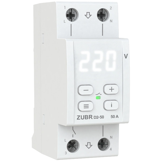 Струм, А: 50; Спосіб монтажу: На DIN-рейку; Кількість фаз: 1 ф. (230 Вольт). Реле напруги ZUBR D2 захищає від критичних стрибків високої та низької напруги, а також від обриву нуля. У випадку аварійної ситуації реле напруги відключає навантаження, а при нормалізації включає назад. Широкий функціонал реле напруги дозволяє оптимізувати кількість спрацьовувань завдяки індивідуальним налаштуванням під вашу мережу. TrueRMS знижує вплив мережевих перешкод на точність вимірювання напруги, коли форма напруги відрізняється від синусоїди. Завдяки цьому алгоритму реле вимкне навантаження до того, як стрибок напруги негативно вплине на підключені прилади. Реле напруги ZUBR D2 дуже компактний, займає 2 стандартні модулі в розподільному щиті. Його монтаж відбувається у розподільний щиток на стандартну DIN-рейку шириною 36 мм.