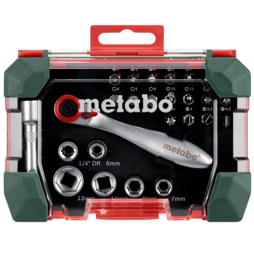 Складається з: Інструментальні насадки S 2. L= 25 мм (18 шт.): по 1 x PH 1, PH 2, PH 3; PZ 1, PZ 2, PZ 3; H 3, H 4, H 5, H 6; T 10, T 15, T 20, T 25, T 30; SL 4, SL 5,5, SL 6,5. Торцеві ключі (6 шт.): по 1 x 1/4", 6 мм, 7 мм, 8 мм, 10 мм, 13 мм. 1 x подовжувач; 1 x тримач з реверсом. Інструментальні насадки з хромованадієвої сталі (якість S2); насадки з кольоровим кодуванням: для швидкого та простого знаходження потрібної насадки; високоякісна тріскачка; торцевий ключ із хромованадієвої сталі; високоякісна міцна коробка спеціальної конструкції Metabo; кріплення з отворами євростандарту.