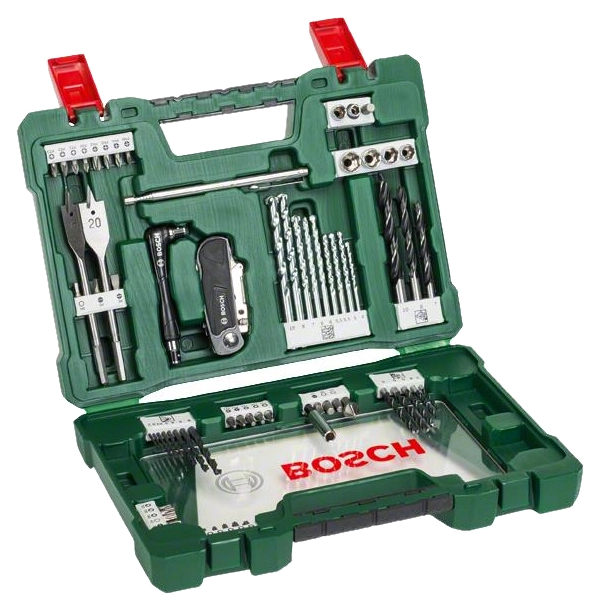 Набір Bosch V-Line складається із 68 предметів. У практичну пластмасову валізу увійшли свердла по каменю, металу та деревині, пір'яні свердла, біти, торцеві ключі, тримач біт, зенкер та магнітний тримач для біт, двосторонній ніж та магнітна ручка.