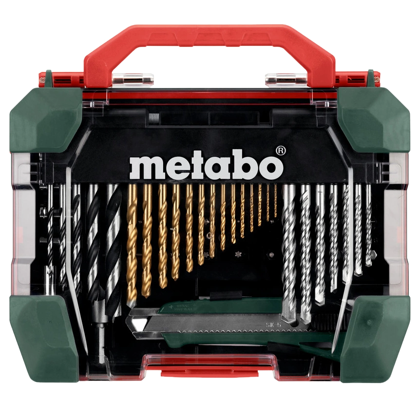 Складається з: Свердла по металу HSS-TiN (14 штук): 1,5 мм x 2, 2,0 мм x 2, 2,5 мм x 1, 3,0 мм x 2, 3,5 мм x 1, 4,0 мм x 1, 4,5 мм x 1, 5,0 мм x 1, 5,5 мм x 1, 6,0 мм x 1, 6,5 мм x 1. Свердла по каменю з твердосплавними напайками (7 шт.): 4,0 мм x 1, 5,0 мм x 1, 6,0 мм x 2, 7,0 мм x 1, 8,0 мм x 1, 10,0 мм x 1. Свердла для деревини (5 шт.): по 1 x 4,0 мм, 5,0 мм, 6,0 мм, 8,0 мм, 10,0 мм; Плоскі свердла для деревини (2 шт.): по 1 x 16,0 мм, 22,0 мм. Інструментальні насадки S 2, L= 25 мм (18 шт.): по 1 x PH 1, PH 2, PH 2, PH 3; PZ 1, PZ 2, PZ 2, PZ 3; SL 4, SL 6, SL 7 T 15, T 20, T 25; H 3, H 4, H 5, H 6; Торцеві ключі (4 шт.): по 1 x 7 мм, 8 мм, 9 мм, 10 мм. 1 x шаблон, 1 x ніж для шпалер, 1 x магнітний тримач. інструментальних насадок, 1 x зенкер, 1 x перехідник для торцевих ключів. Високоякісний міцний футляр спеціального дизайну Metabo.