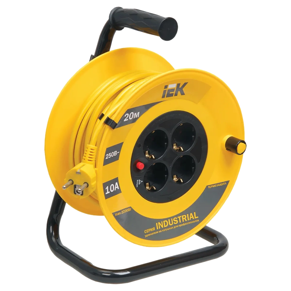 За допомогою подовжувача на котушці легко підключити віддалену на відстань до 20 м від стаціонарної розетки електроустаткування. Теплове реле захищає від перевищення максимально допустимого навантаження, що підключається, а ізолююча прогумована ручка забезпечує безпечну і комфортну експлуатацію. Рама із замкнутим контуром виготовлена із сталевої труби. Жовтий кабель котушки добре видно в пилу в умовах будівельного майданчика.