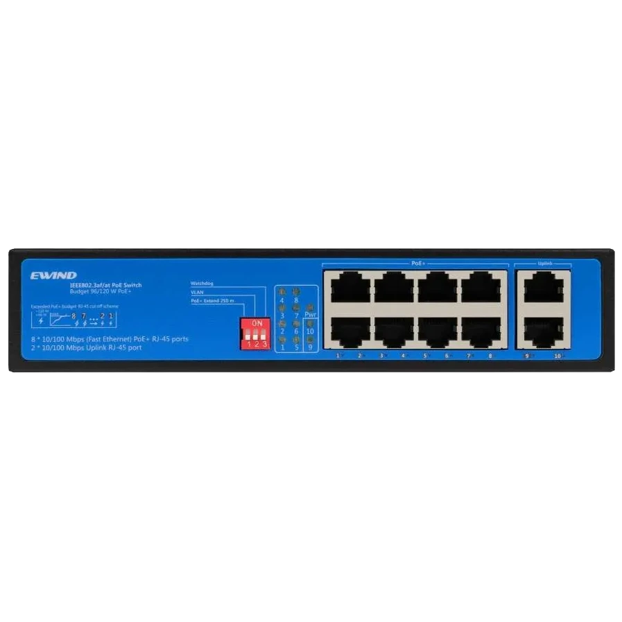 ● Downlink порти: 8x RJ45 (10/100M) з підтримкою PoE;● Uplink порти: 2x RJ45 (10/100M);● Протокол PoE: IEEE802.3af/at бюджет 120 Вт;● Живлення: AC100~240V;● Робоча температура: -20º – + 55ºC;● Підтримка AI Watchdog, самовідновлення портів, VLAN, збільшення відстані до 300 метрів, автоматична зміна швидкості, пріоритетний порт та скорочення витрат after-resale;● 195x130x40 мм