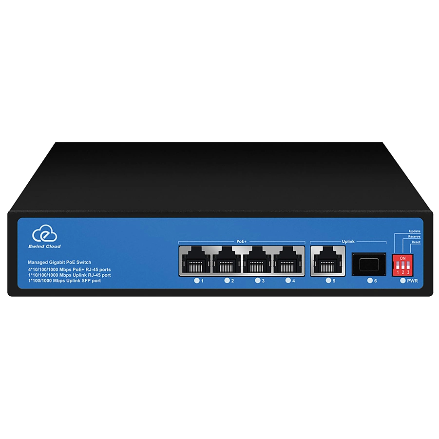 ● Downlink порти: 4x RJ45 (10/100M/1000M) з підтримкою PoE;● Uplink порти: 1x SFP (10/100/1000M), 1x RJ45 (10/100/1000M);● Протокол PoE: IEEE802.3af/at бюджет 65 Вт;● Живлення: AC100~240V;● Робоча температура: -20º – + 55ºC;● Підтримує віддалене керування хмарною платформою EWIND та роботу мобільної програми, пропонуючи різні оповіщення в реальному часі, виявлення несправностей та перезапуск порту тощо;● 195x130x40 мм