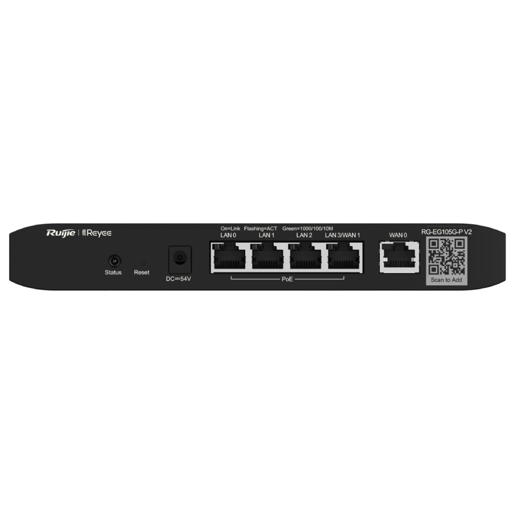 Iнтелектуальний 5-портовий маршрутизатор, Зручне налаштування через веб-Ruijie Cloud, або мобільний додаток; 4 порти PoE/POE+, Потужності POE 54 Вт; 5 портів 10/100/1000M Base-T, підтримка до 2 портів WAN; RAM 128 МБ; ROM 16 МБ; Пропускна здатність 500 Мбіт/с, Підтримка локальної переадресації роумінгу рівня L2/L3 між точками доступу, До 100 одночасних користувачів, Живлення 220В