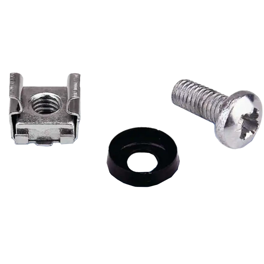 Кріпильний комплект призначений для встановлення обладнання на монтажні напрямні комутаційних шаф, стійок, кронштейнів. Складається із заставної гайки, гвинта та пластикової шайби. Кріпильний комплект можна використовувати в будь-якому устаткуванні, виконаному в 19" стандарті.