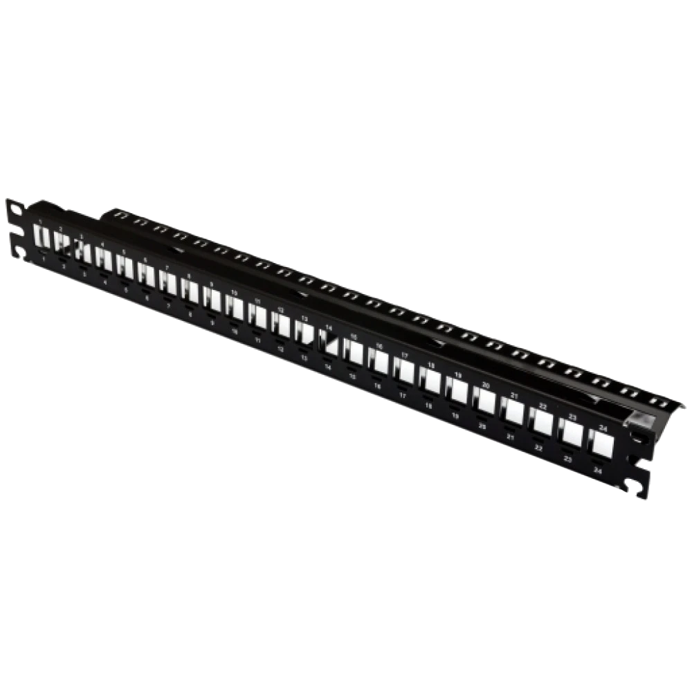 Модульна патч-панель 24 порти – одна із складових частин структурованої кабельної системи (СКС), призначена для розключення витої пари з боку точки комутації, наприклад в серверній шафі або комутаційній стійці. Можливість комбінувати екрановані модулі (FTP/STP) з модулями без екрану (UTP); Всі порти промарковані цифрами; З лицьової сторони панелі є спеціальні отвори, які дозволяють натиснути на защіпку KeyStone та демонтувати модуль; Патч-панель з кабельним організатором до якого підводяться кабелі та кріпляться пластиковими стяжками