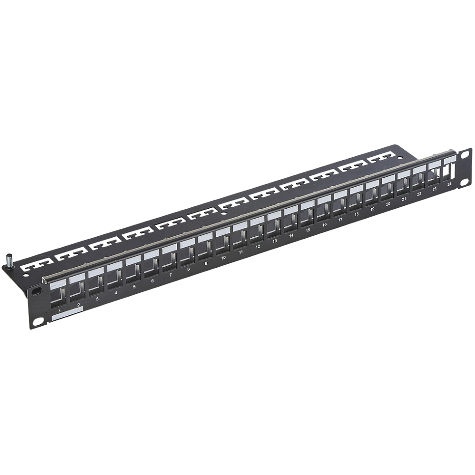 Модульна патч-панель 19″ 24 порту KeyStone – одна із складових частин структурованої кабельної системи (СКС), призначена для розключення витої парі з боку точки комутації, наприклад, у серверній шафі або комутаційній стійці. Патч-панель виготовлена з алюмінію та пофарбована порошковою фарбою. Конструкція передбачає кабельний органайзер для фіксації 24 кабелів кручений пари пластиковими стяжками. На підставі корпусу передбачено висновок для підключення заземлення. Для портів, що не використовуються, під модулі передбачені чорні пластикові заглушки з кріпленням формату KeyStone (опціонально). На лицьовій частині передбачено місце для маркування портів.