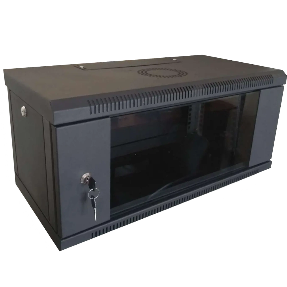 Модульна конструкція. Двері на замку з тонованим загартованим склом та можливістю встановлення петель у дзеркальне положення. Передня пара рейок, що регулюються по глибині. Розсувні кабельні введення закриті заглушками на гвинтах. Місце під один вентилятор. Бокові стінки, що знімаються на замках. Знімна задня стінка