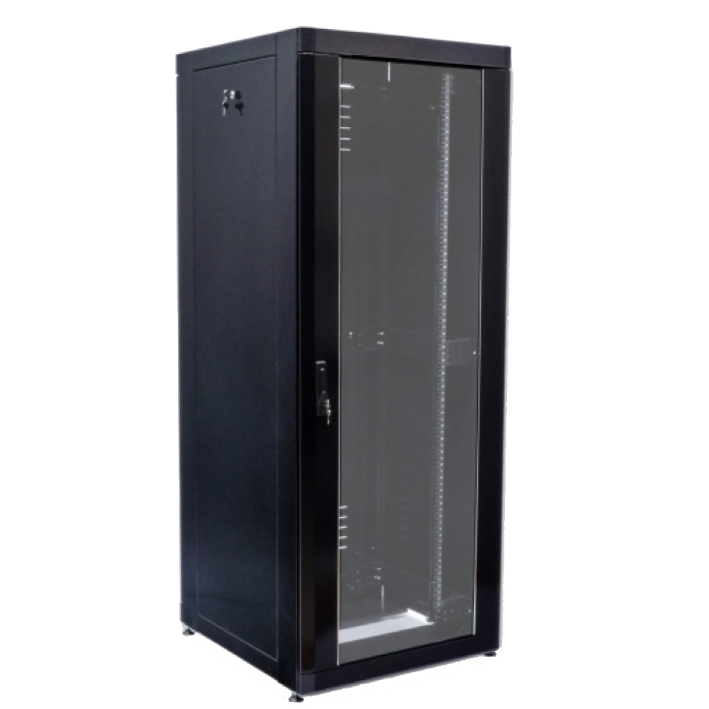 Двері передні гартоване скло і замок із поворотною ручкою;Двері задні суцільнометалеві з перфорацією типу "зябра" і замком;Бічні стінки знімні із замком;Напрямні дві пари з маркуванням юнітів;Колір чорний, RAL 9005;Товщина металу, мм 1 – 2;Максимальне навантаження, кг 700;Клас захисту від зовнішніх факторів IP 20