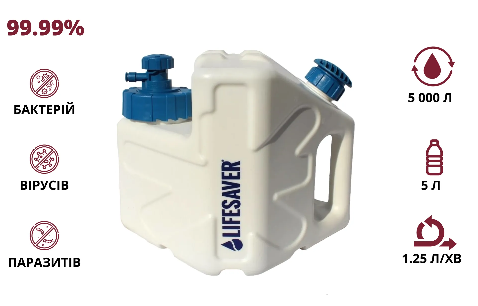 Надійний портативний фільтр для води, здатний забезпечити 5000 літрів чистої води для сімейного використання. LifeSaver Cube вміщує до 5 літрів за один раз і призначений для підтримки сімей під час руху, включно з сім’ями, які знаходяться далеко від водопостачання або для надання допомоги в надзвичайних ситуаціях організаціями та урядами. Включає змінний диск із активованим вугіллям для зменшення вмісту хімічних речовин і важких металів, а також видалення неприємного смаку та запаху, ефективний для обсягу до 100 літрів. Cтандартні диски з активованим вугіллям, які використовуються в усіх продуктах LifeSaver, були перевірені на відмінне та стабільне зниження вмісту важких металів і хімікатів, протягом заявленого терміну служби для ряду зразків забруднювачів, таких як хлор, свинець, нікель і кадмій. Також покращуючи смак і запах.