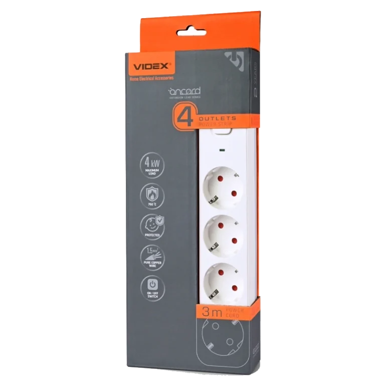 Мережевий подовжувач з кнопкою White VIDEX ONCORD з/з 4п 3м (3×1.5мм)