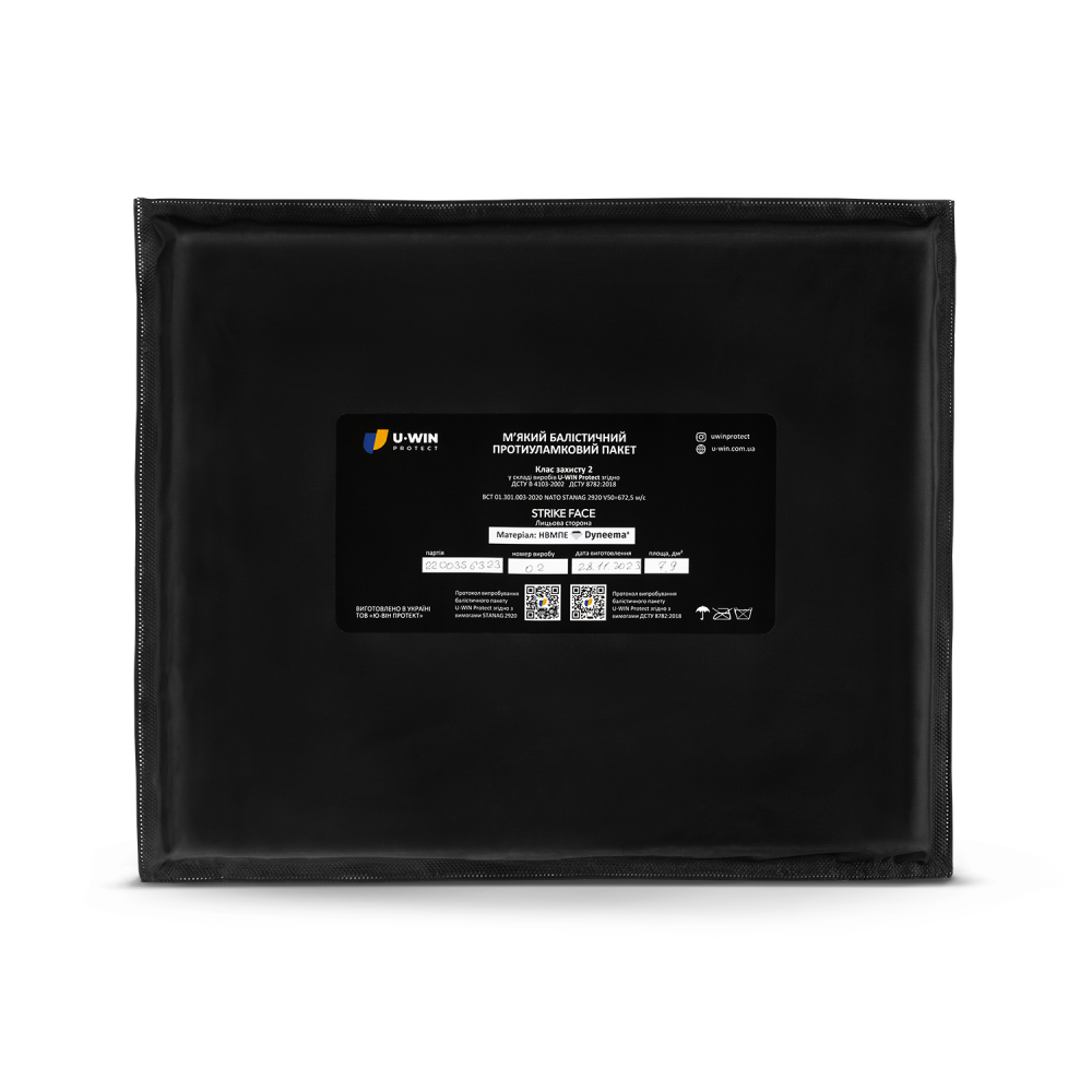 ● Балістичний пакет розроблений під дизайн першої секції килимка для сидіння U-WIN;● Площа захисту пакета – 7,9 дм.кв.;● Балістичний пакет виготовлений із надвисокомолекулярного поліетилену (HPPE) бренду Dyneema®️ (USA). Цей матеріал є найкращим для балістичного захисту та відрізняється найбільш стабільною якістю;● У кожному пакеті – 29 шарів балістичної тканини;● Має 2-й клас захисту ДСТУ 8782:2018 у складі виробів U-WIN Protect підтверджений Протоколом випробування;● Виріб U-WIN Protect разом з пакетом витримує на пробій кулю з пістолета Макарова масою 5,9 грамів, кулю з пістолета Люгер масою 8 грамів, кулю з пістолета Токарєв 7,62х25 мм масою 5,5 грамів з відстані 5 метрів без перевищення 25 мм позаперешкодної деформації;● Гранична швидкість на пробивання імітатором уламка 672,5 м/с відповідно до стандарту НАТО STANAG 2920 підтверджена Протоколом випробування;● Пакет стійкий до температури від -40℃ до +70℃.