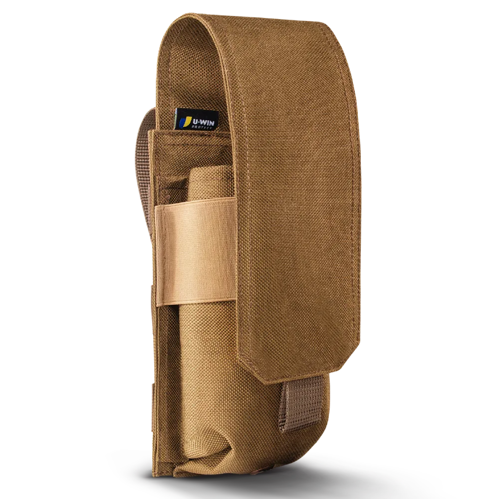 Закритий результат U-WIN Coyote призначений для транспортування запасних магазинів АК. Має покращену конструкцію з широкою кришкою, що фіксується на липучці. При необхідності відкрити комплект для перезарядки та дістати обойму – верхня частина легко і швидко відкидається. У закритому ж стані захищає вміст від випадання та дощу. У внутрішньому відсіку передбачено гуму, завдяки якій магазини тримаються міцніше і не розхитуються під час руху. Сюди міститься два ріжки від АК. Модель U-WIN Coyote однотонна. Поєднується з рештою екіпірування такого кольору і технічно сумісна з плитоносками, що володіють ремінною системою MOLLE. Підсумок завжди знаходиться під рукою.