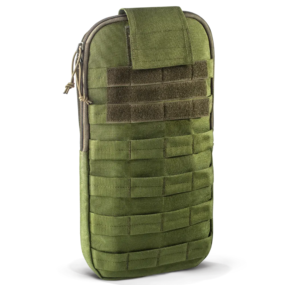 Підсумок U-WIN Olive для гідратора забезпечує бійця можливістю не відволікатися та попити води у будь-який зручний момент. У сумку ставиться спеціальна ємність, від якої проводиться питна трубка. Підсумок може бути навіть за спиною. Наприклад – на плитоносці або рюкзаку. За положення гідратора можна не побоюватися, оскільки він надійно фіксується всередині, у тому числі липучками, і закривається зверху. Навіть якщо вода потрапить у внутрішню частину — вона стіче спеціальними відводами, не промочивши при цьому тканину. Зовнішній бік сумки має MOLLE-інтерфейс для кріплення інших модулів. Також присутня панель для патчів та шевронів. При необхідності екіпірування U-WIN легко знімається. Військові регулярно це роблять, наприклад, поповнення резервуара.
