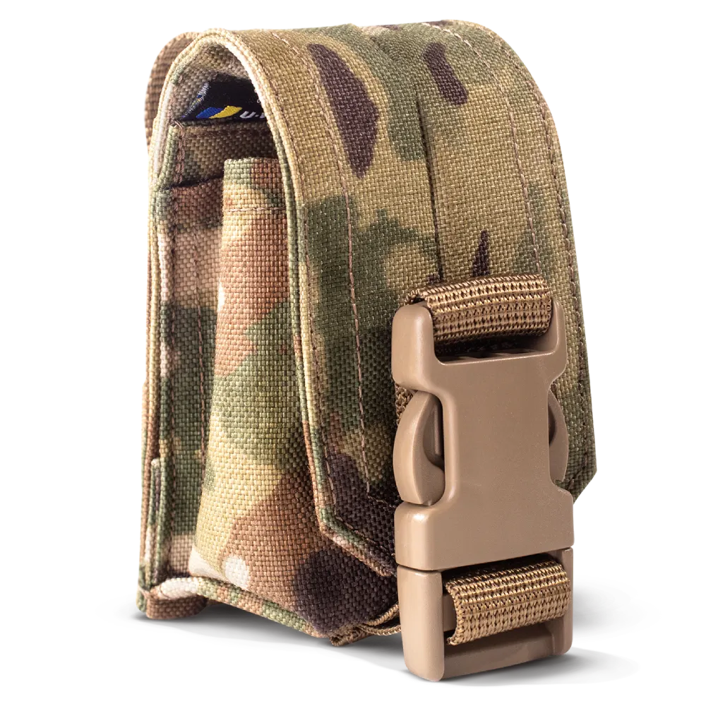 Гранатний підсумок U-WIN MultiCam – обов'язкова складова екіпірування військових, необхідна для правильного, зручного та безпечного зберігання гранат. У тому числі осколкових. Складається з внутрішньої кишені, в якій розміщується одна граната, а також роздвоєний клапан, застібки типу фастекс і стропи для кріплення до форми на інтерфейс MOLLE. Висота регулюється, тому можна розмістити всередині гранати різного розміру. У проріз вставляється верхня частина для кращої фіксації. Вміст не піддається впливу під час різких рухів і не випадає. Відкриття відбувається за лічені секунди, однією рукою. Для сухості та чистоти всередині передбачено водовідведення. Тканина виробу U-WIN не вбирає вологу, а забарвлення MultiCam належним чином камуфльоване.