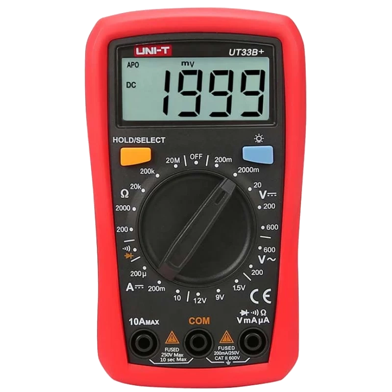 UNI-T UT33B+ цифровий мультиметр з функцією тестування батарей, являє собою нове покоління недорогих мультиметрів. Інноваційний промисловий дизайн мультиметра забезпечує його безпеку при падінні з висоти 2 метри. Новий РКІ дисплей забезпечує кращий інтерфейс користувача. Усі мультиметри серії UT33+ виготовлені так, щоб забезпечувати безпеку роботи в середовищі CAT ll 600В. Мультиметр UT33B+ застосовується для вимірювання постійної та змінної напруги в діапазоні до 600В AC/DC, сили струму DC до 10А, опору до 200 МОм, а також виконання перевірки діодів та тестування на провідність. Вибір меж вимірювань проводиться вручну.