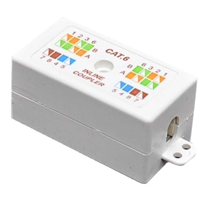З’єднувальна розетка служить для з’єднання з мінімальним загасанням мідного сигналу кабелю категорії 5е. Є пластмасовою розбірною коробочкою, з двох сторін якої є стяжки для закріплення оболонок кабелів, всередині знаходяться місця для жил кабелів під «забивання». Зверху на кришці розетки нанесено схему рекомендованого розташування жил кабелю. Кришка кріпиться за допомогою гвинта. Розетка сполучна, категорії 6, неекранована.